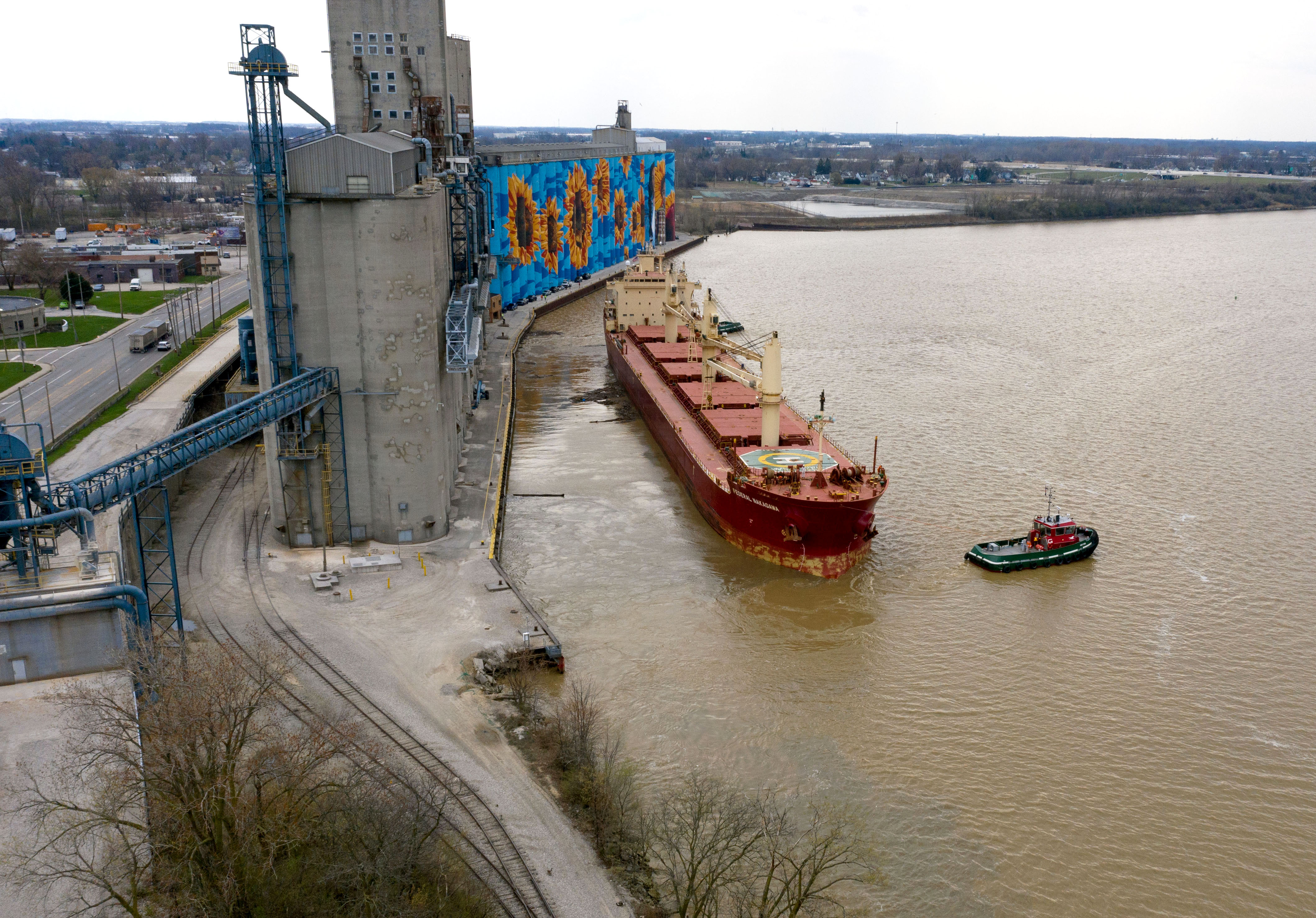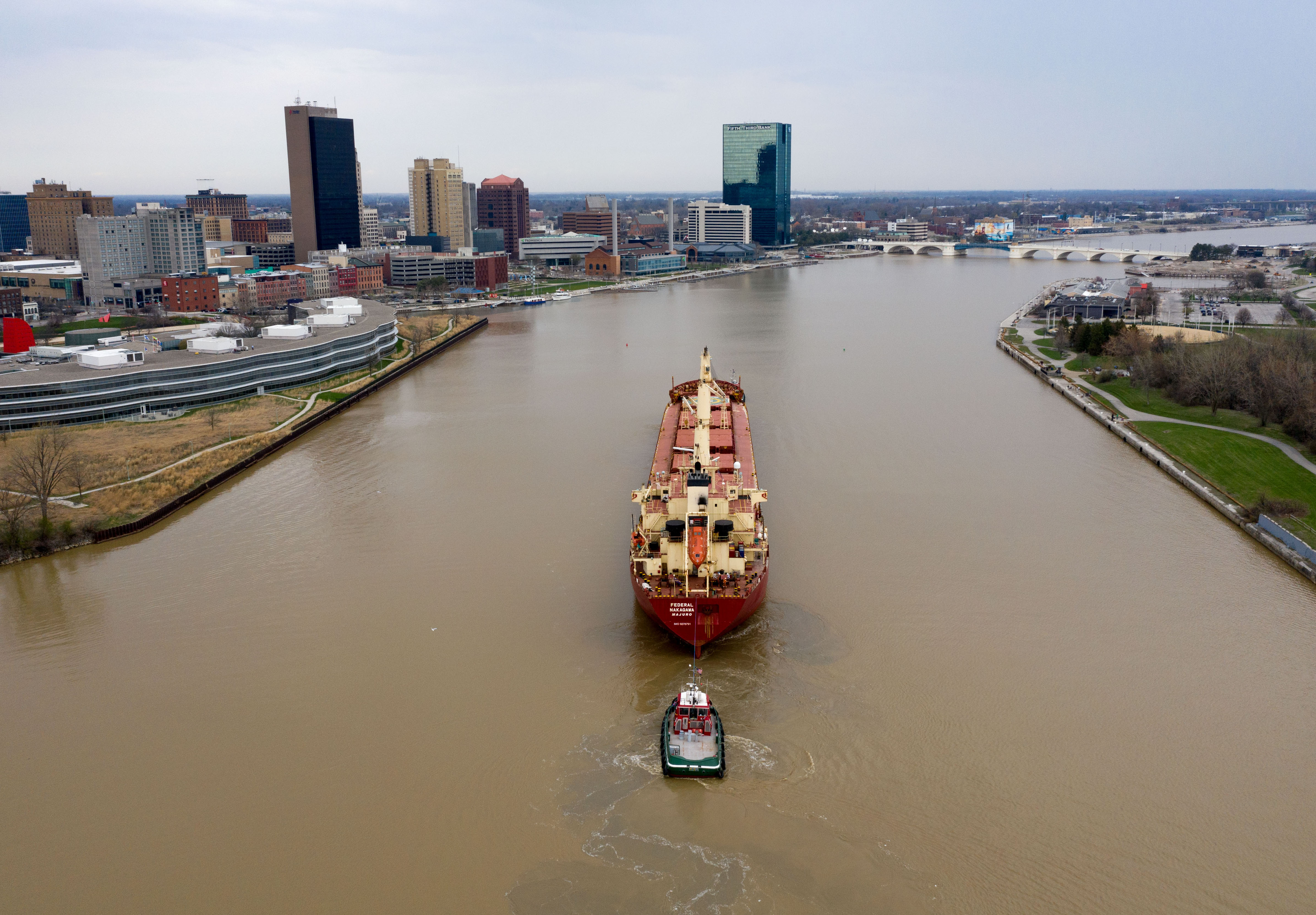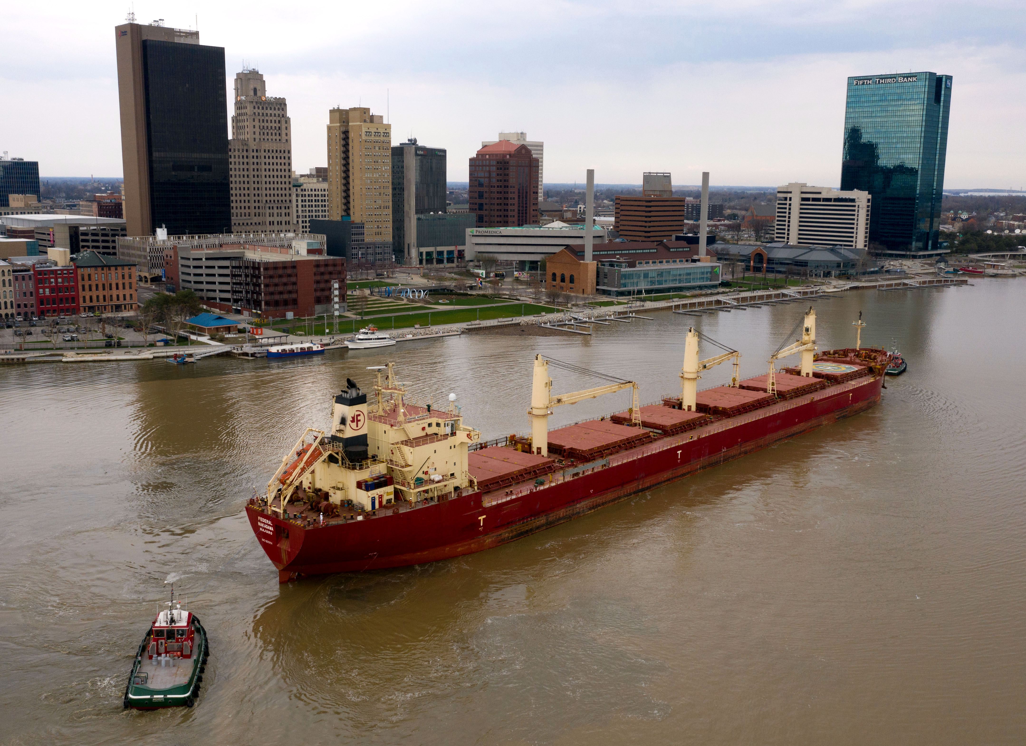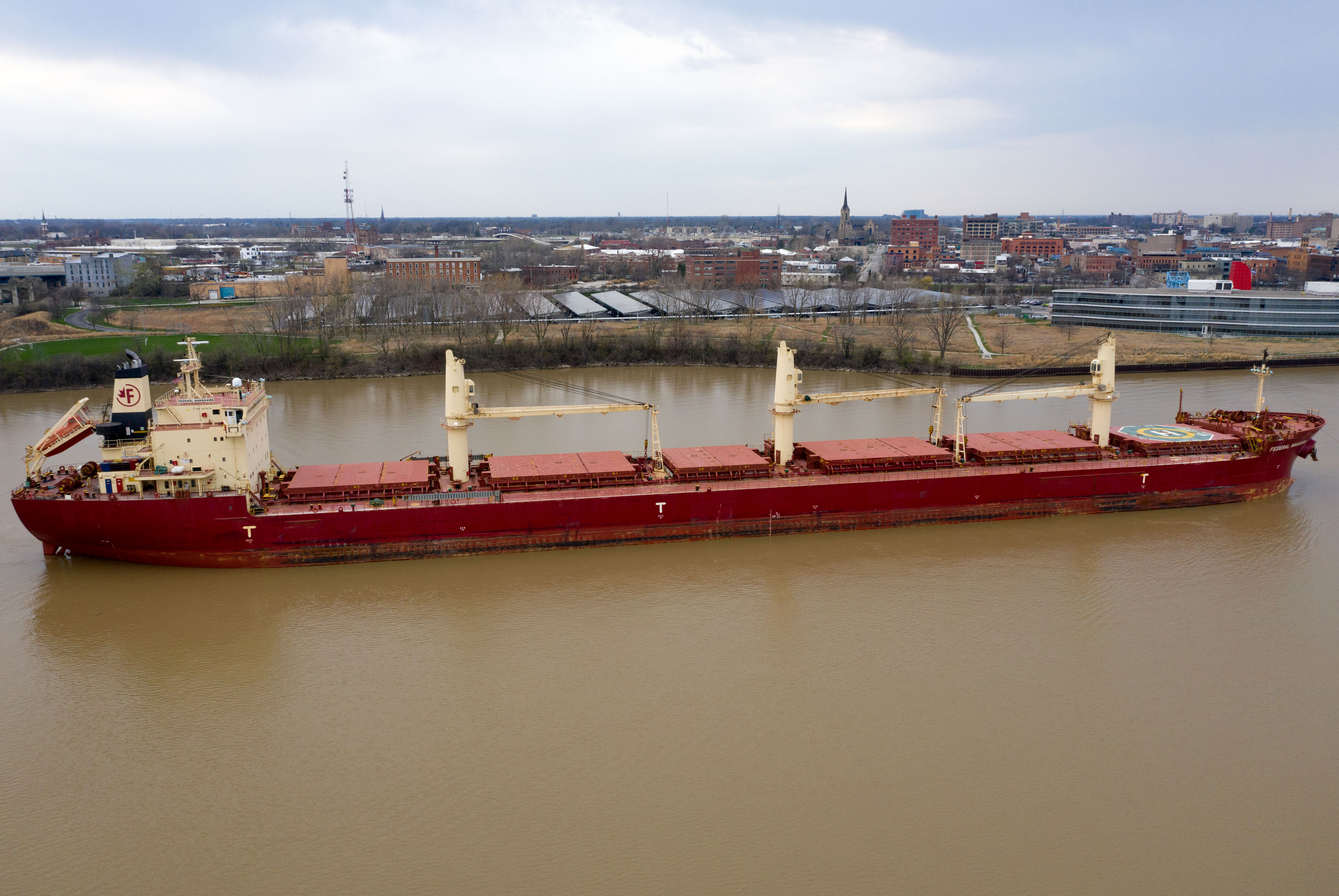 The M.V. Federal Nakagawa, which arrived at the ADM elevator in late March, loaded corn for Ireland and left Thursday after waiting several days for Maumee River flooding, which caused dangerous currents in the shipping channel, to ease up.