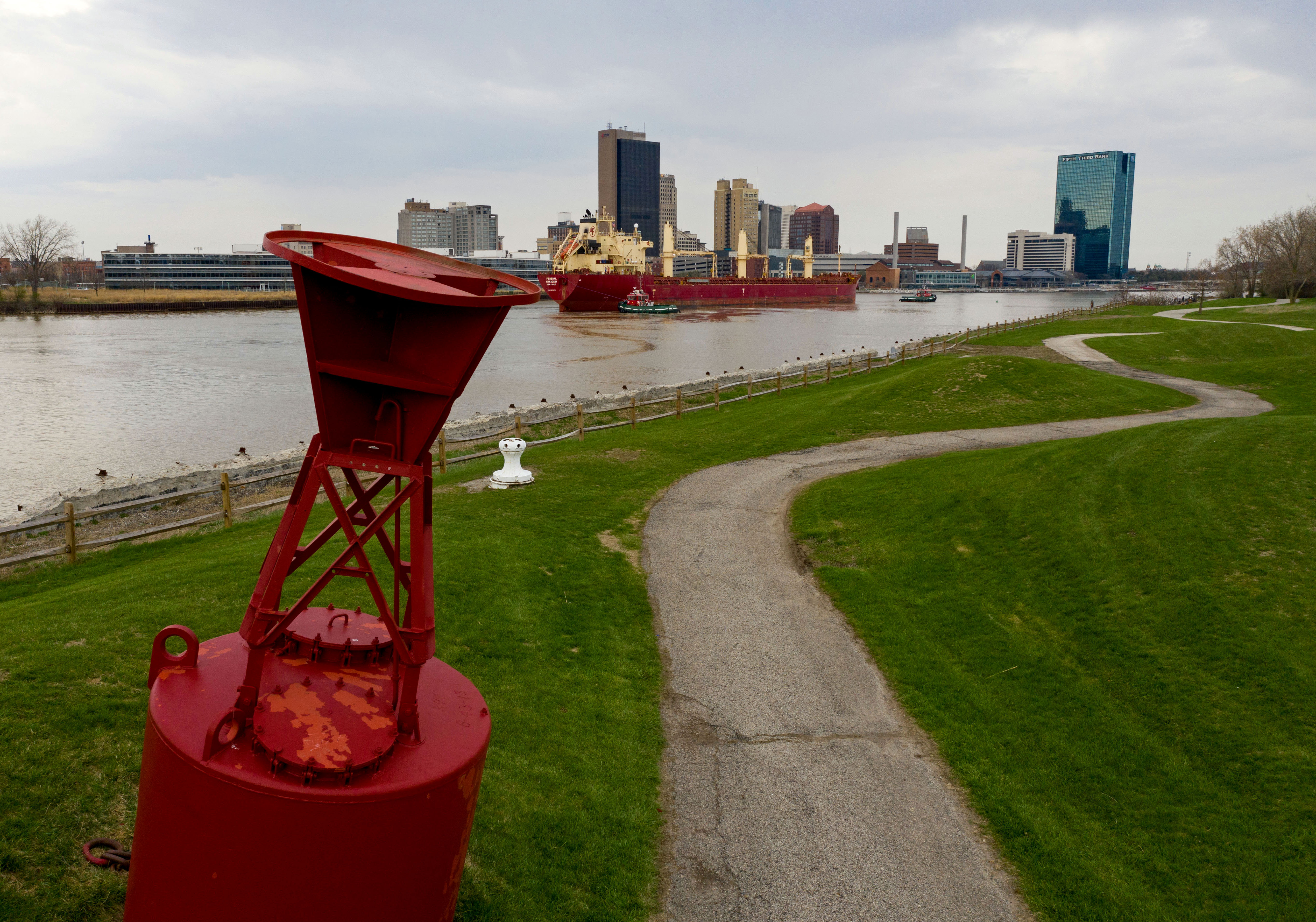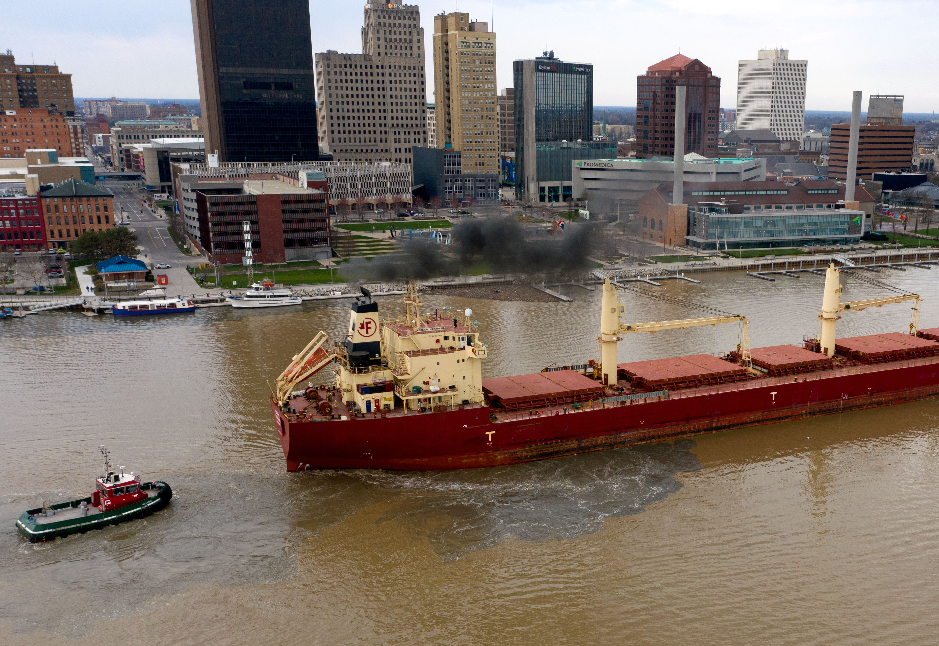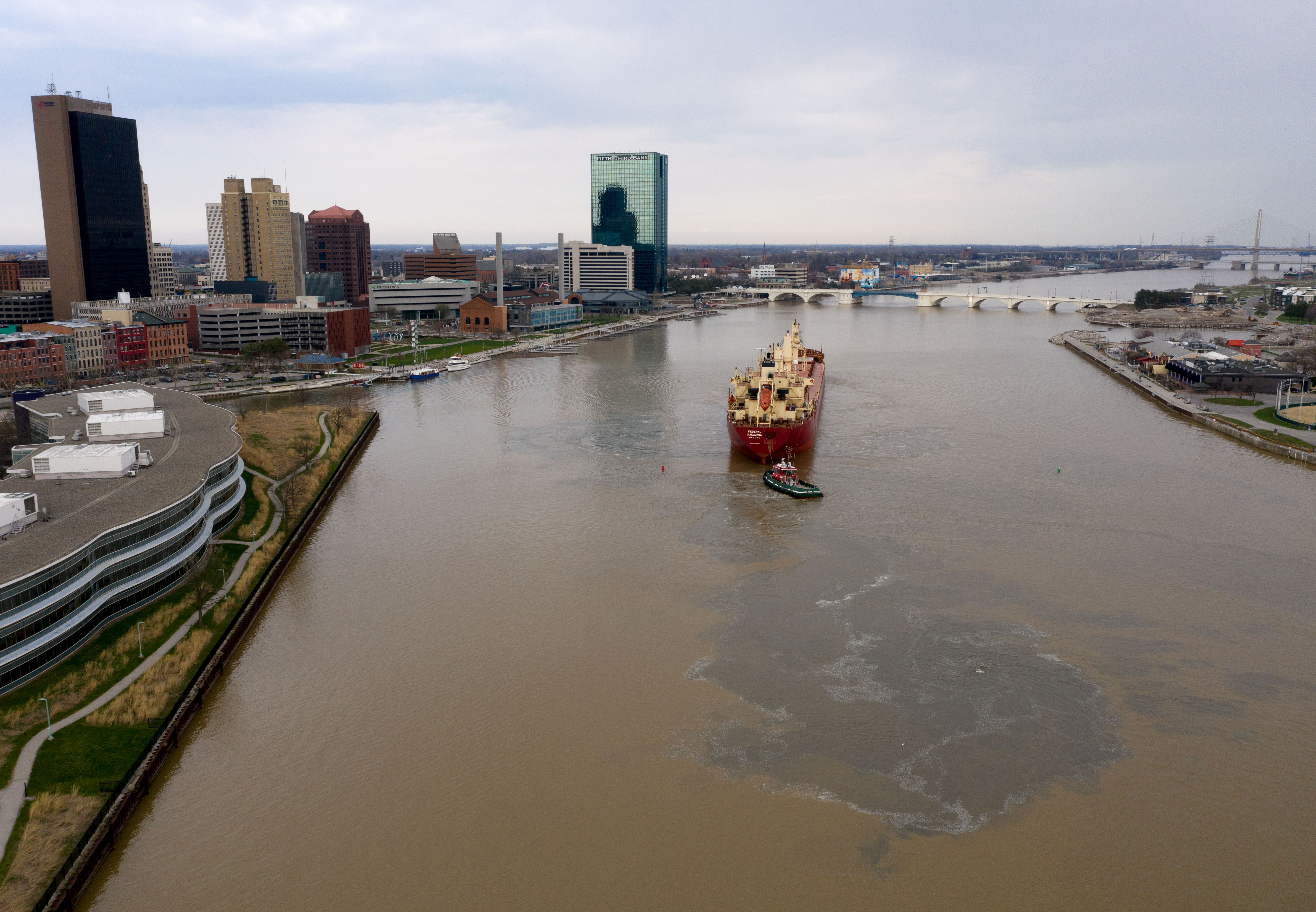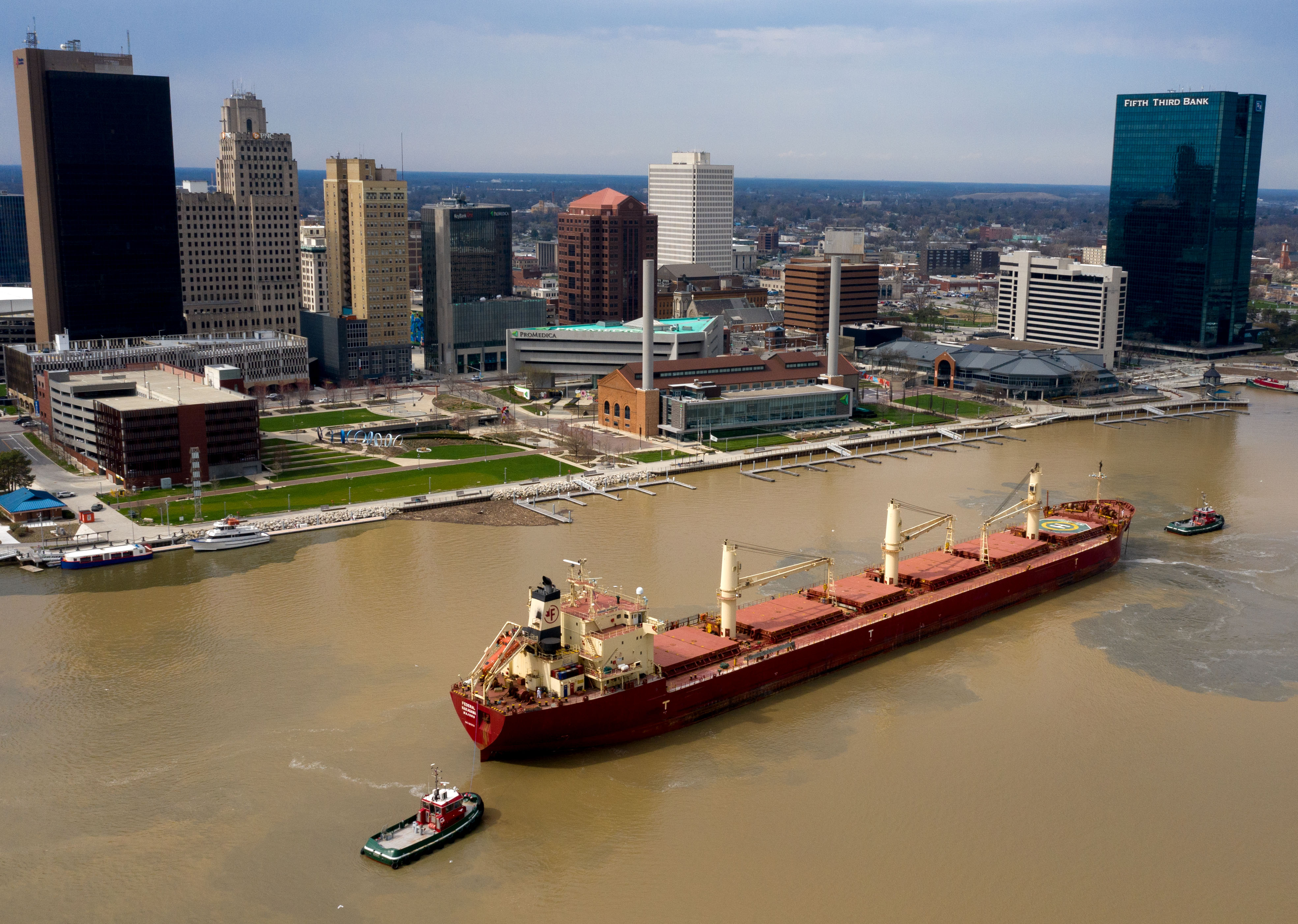 The M.V. Federal Nakagawa, which arrived at the ADM elevator in late March, loaded corn for Ireland and left Thursday after waiting several days for Maumee River flooding, which caused dangerous currents in the shipping channel, to ease up.